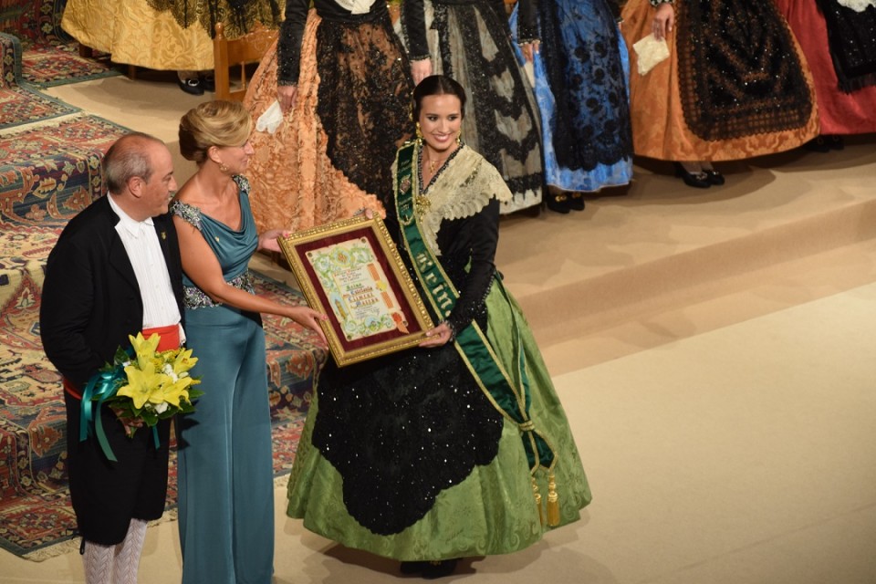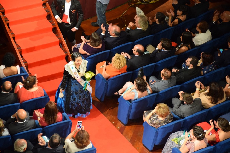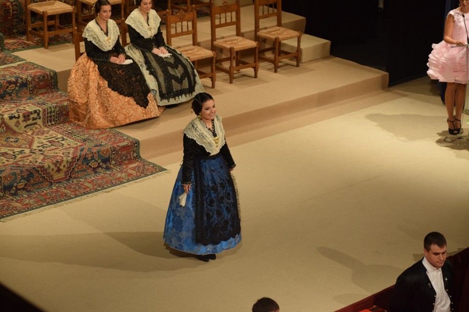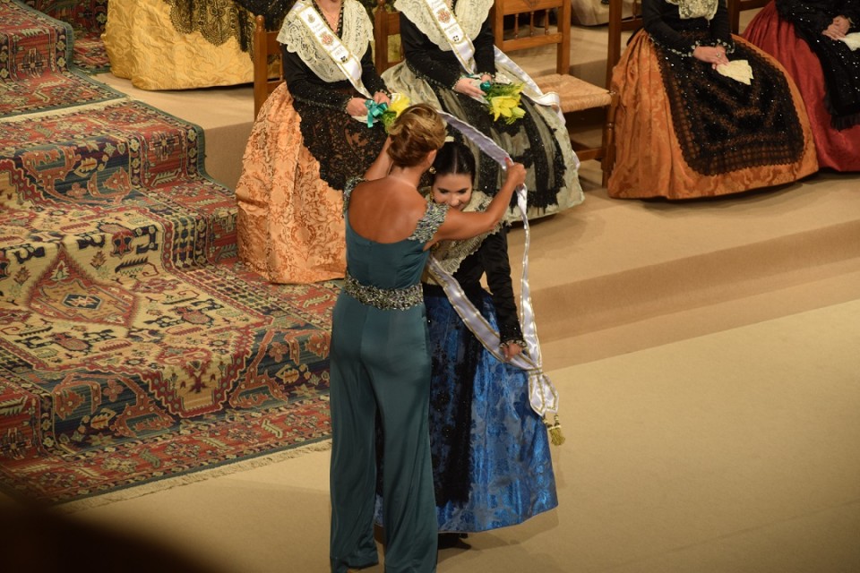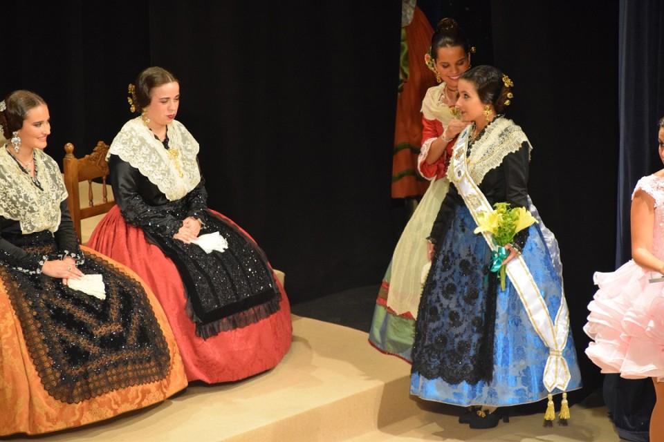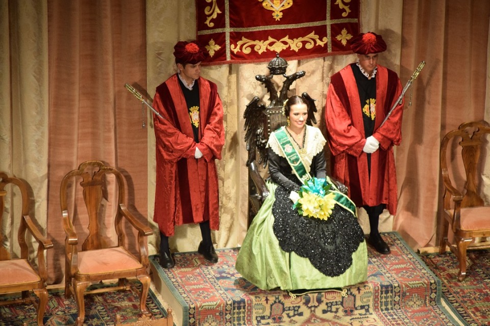El moment àlgid de la nit s’acostava. Pel corredor iniciava la seua desfilada, majestuosa, amb aplom, la Reina de les festes del 2017, Estefanía. S’obre l’escenari, l’Alcaldessa de la ciutat, esperava el moment d’imposar sobre el muscle d’Estefanía, el regi atribut de la banda verda. Moment solemne que va quedar harmonitzat pels clarins de la ciutat, interpretant la Marxa de la ciutat, amb el sorollós cantar de les carcasses, de fons. Estefanía, ja al seu tron reial, emocionada, no podia reprimir una mirada furtiva cap als primers bancs, on els seus familiars aplaudien, a enrabiar, els primers instants del seu regnat.