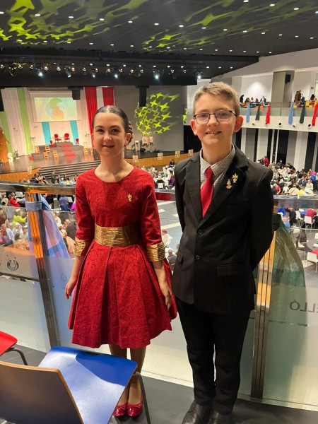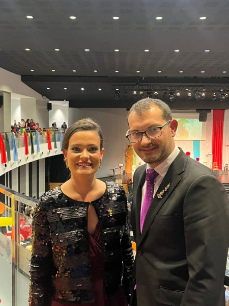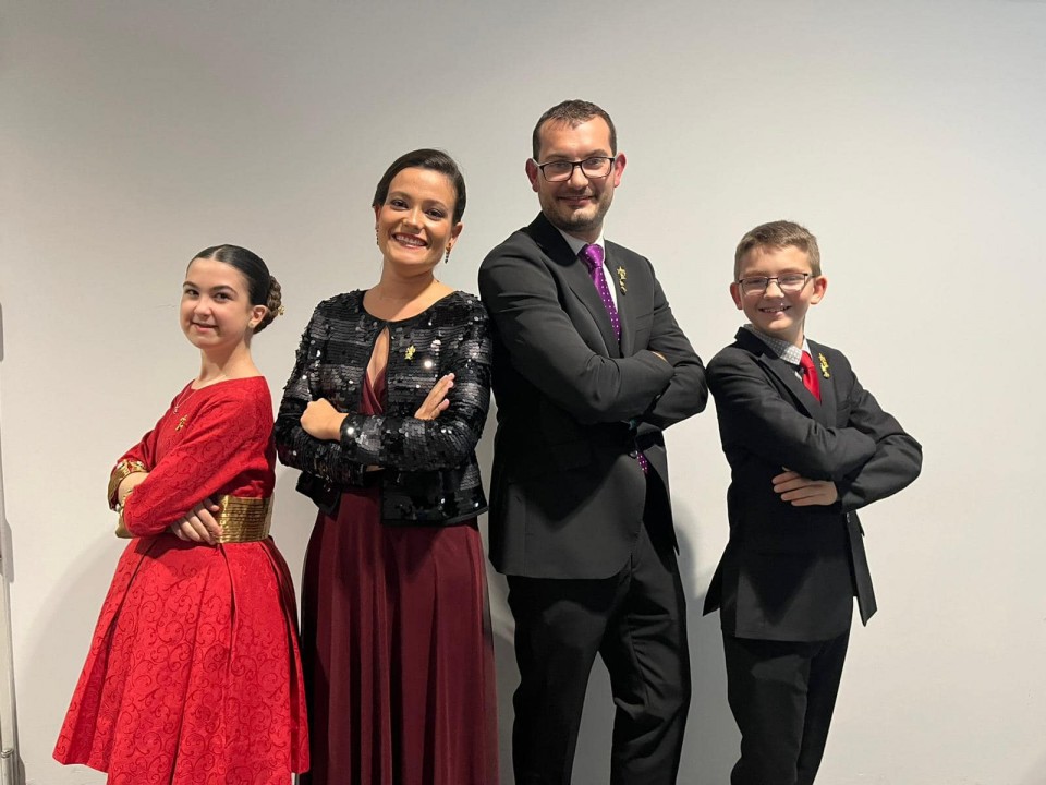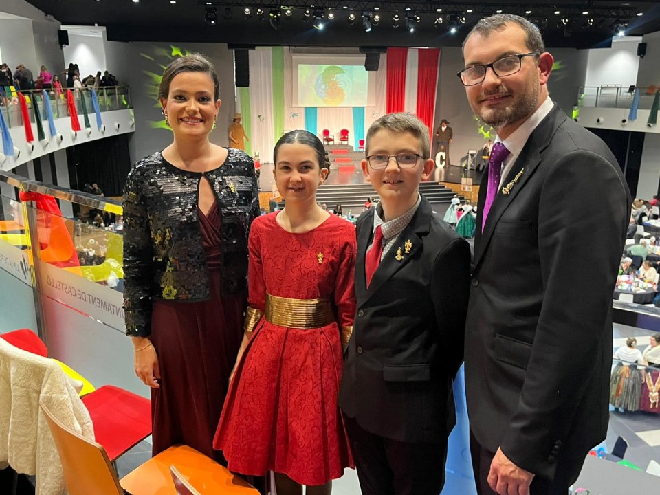 Amanda, Marc, Clara y Esteban, no quisieron faltar a la cita del palacio de la fiesta y desde su lonja, no perdieron detalle de la presentación en ningún momento, y posteriormente recibieron en la misma lonja, lo saluda por parte de la Gaiata 18 Crèmor, próxima comisión encargada de presentar a la semana seguiente.