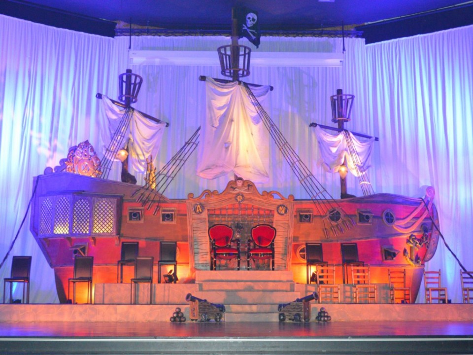 Un impresionante barco pirata dominaba el escenario, cofres y otros motivos corsarios colgaban de los balcones del Palau y todas las mesas, adornadas con monedas de oro, redes y una botella de cristal, dentro de la cual se podía ver enrollado un mapa del tesoro.