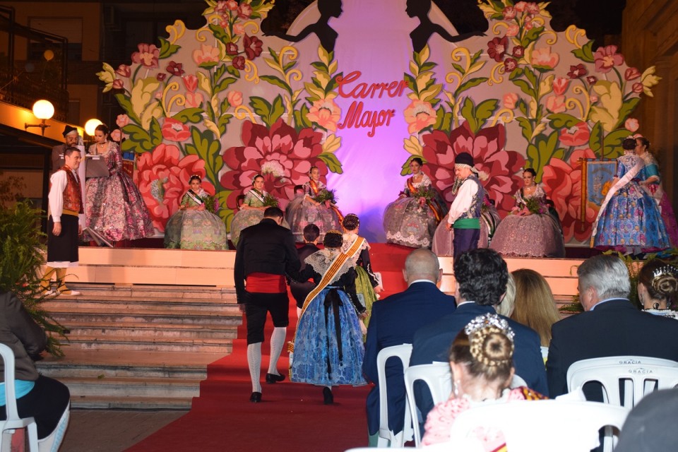 Y por fin llegó el momento más álgido de la noche, la súbida e imposición de las bandas a las bellezas de las fiestas de hogueras 2017, la niña Nerea Ros Sirvent y la señorita Cristina Monllor Martínez, junto a la imposición de la banda a la nueva presidenta infantil, la niña Alba Inmaculada Cruz Fuentes. La hoguera Carrer Major ya tenía sus máximas representantes de sus fiestas y era el turno de las ofrendas, y entre ellas la de nuestra gaiata a cargo de nuestros representantes, Andrea, Alejandra, Juan y Esteban, que apoyados por los miembros de nuestra comisión que se desplazaron a tierras alicantinas quisieron mostrar su pleitesía a las nuevas bellezas.